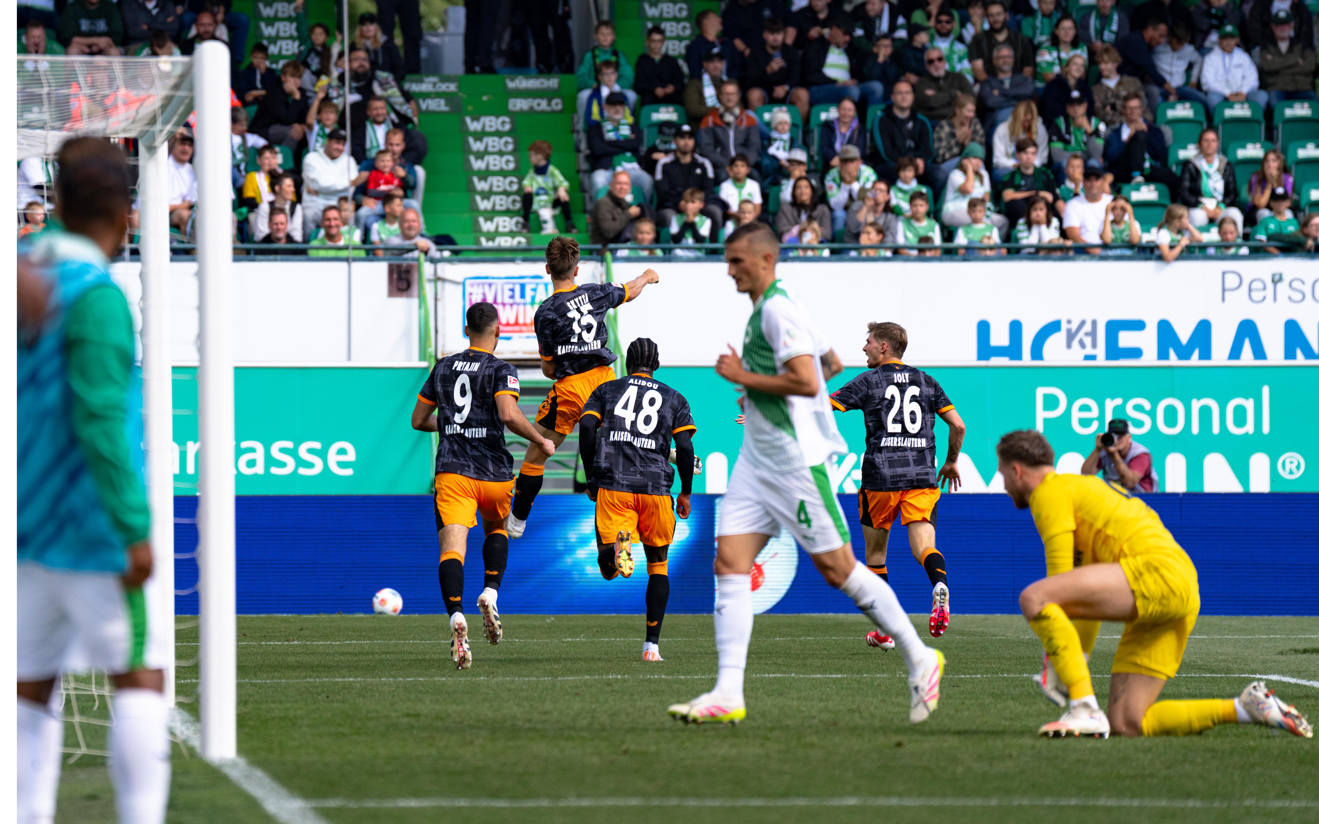Nach einem Ballverlust im Lautrer Aufbauspiel spielt Fürth schnell nach vorne. Aber zum Glück zu unpräzise, das Zuspiel von Futkeu auf Hrgota kommt am Strafraum nicht an.
