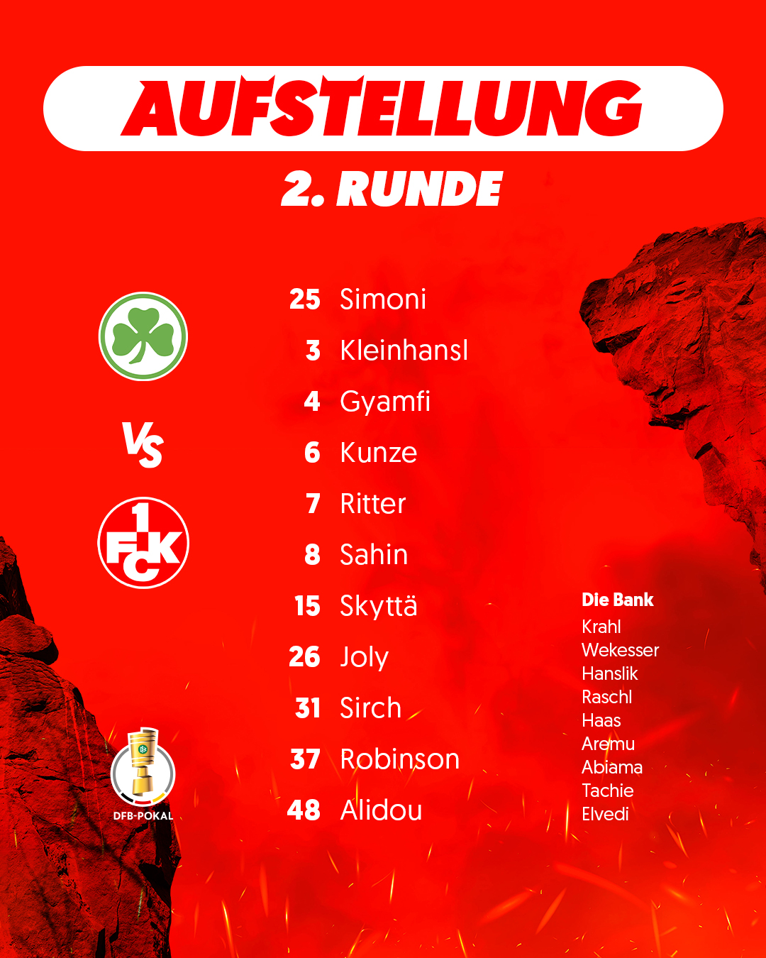 Die Aufstellung ist da! 👹 Mit dieser ersten Elf gehen die Roten Teufel ins DFB-Pokal-Spiel in Fürth 👀