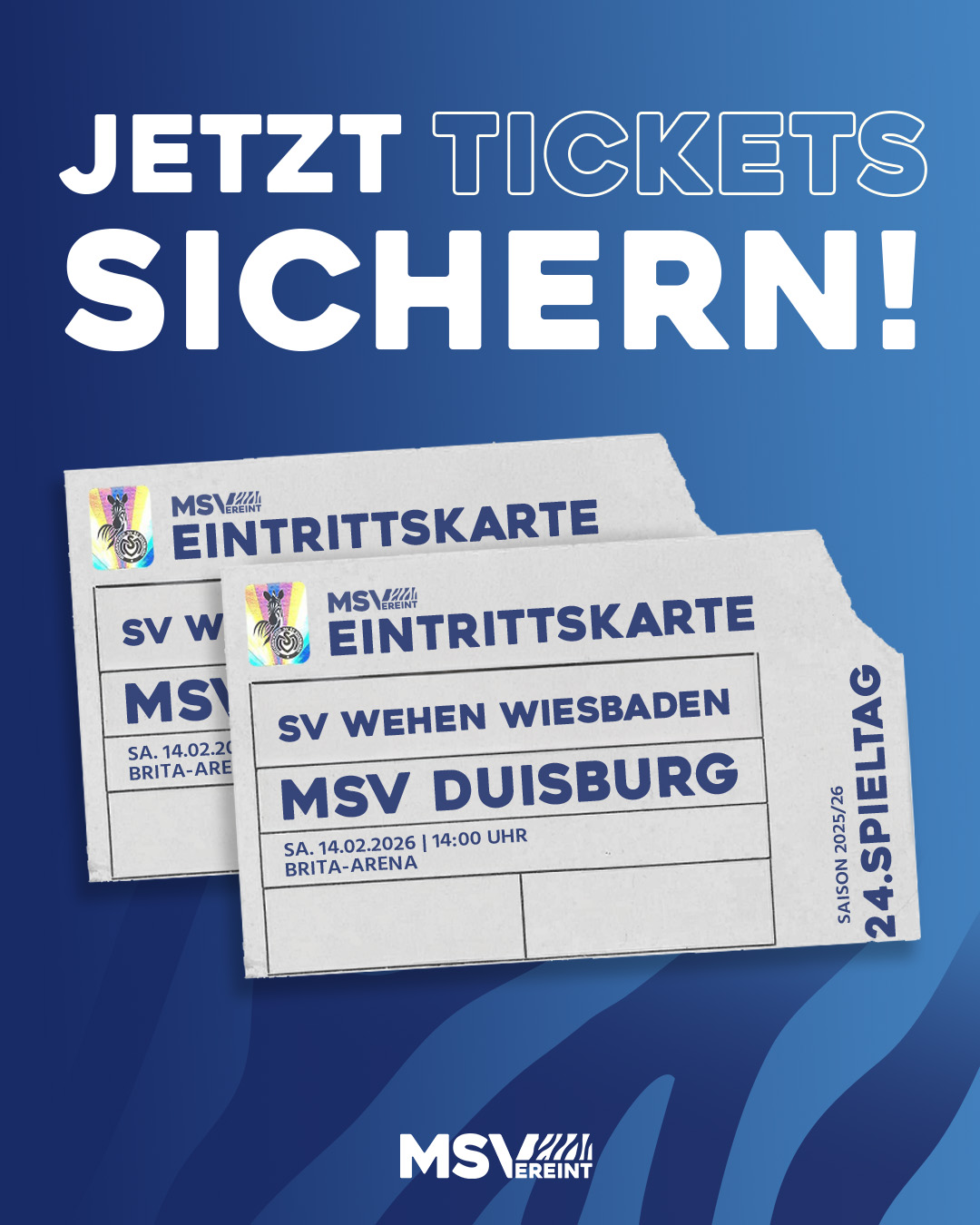 Der letzte Stand aus unserer geheimen Quelle: Über 2.500 Zebras haben bereits ein Ticket, das zum Eintritt in die BRITA-Arena berechtigt. Der Vorverkauf (online & im ZebraShop) läuft natürlich noch ein wenig, sodass wir bestimmt die nächste Tausenderstufe knacken. Im Shop in der schauinsland-reisen-arena gibt's aktuell noch knapp 200 Stehplatz-Karten. Der stationäre Vorverkauf in Duisburg endet am Freitagmittag um 12 Uhr. Sollten noch Gäste-Karten übrig sein, wird der SV Wehen Wiesbaden eine Tageskasse für MSV-Fans einrichten. Wenn ihr lieber sich gehen wollt, holt euch die Karten besser jetzt als nachher.