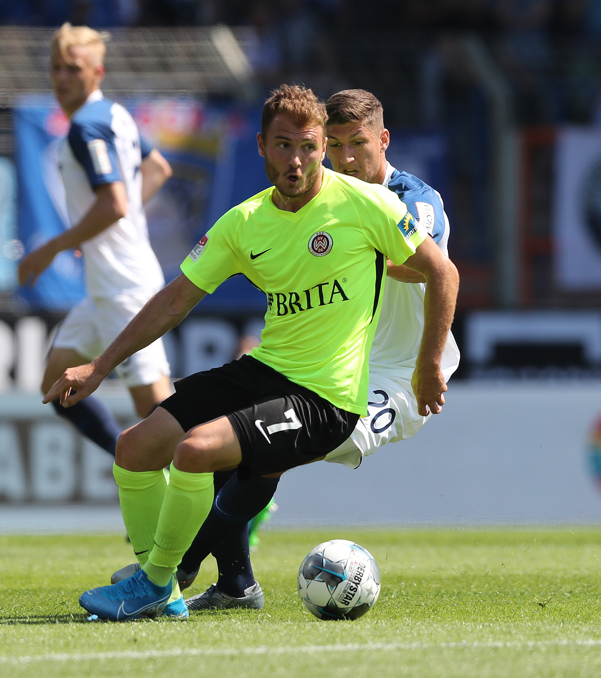 Sussek lässt zwei Gegner hinter sich und versucht es mit einem langen Ball in die Spitze, aber da kommt ein Wehener noch so eben mit dem Bein dran und stoppt den Vorwärtsgang.