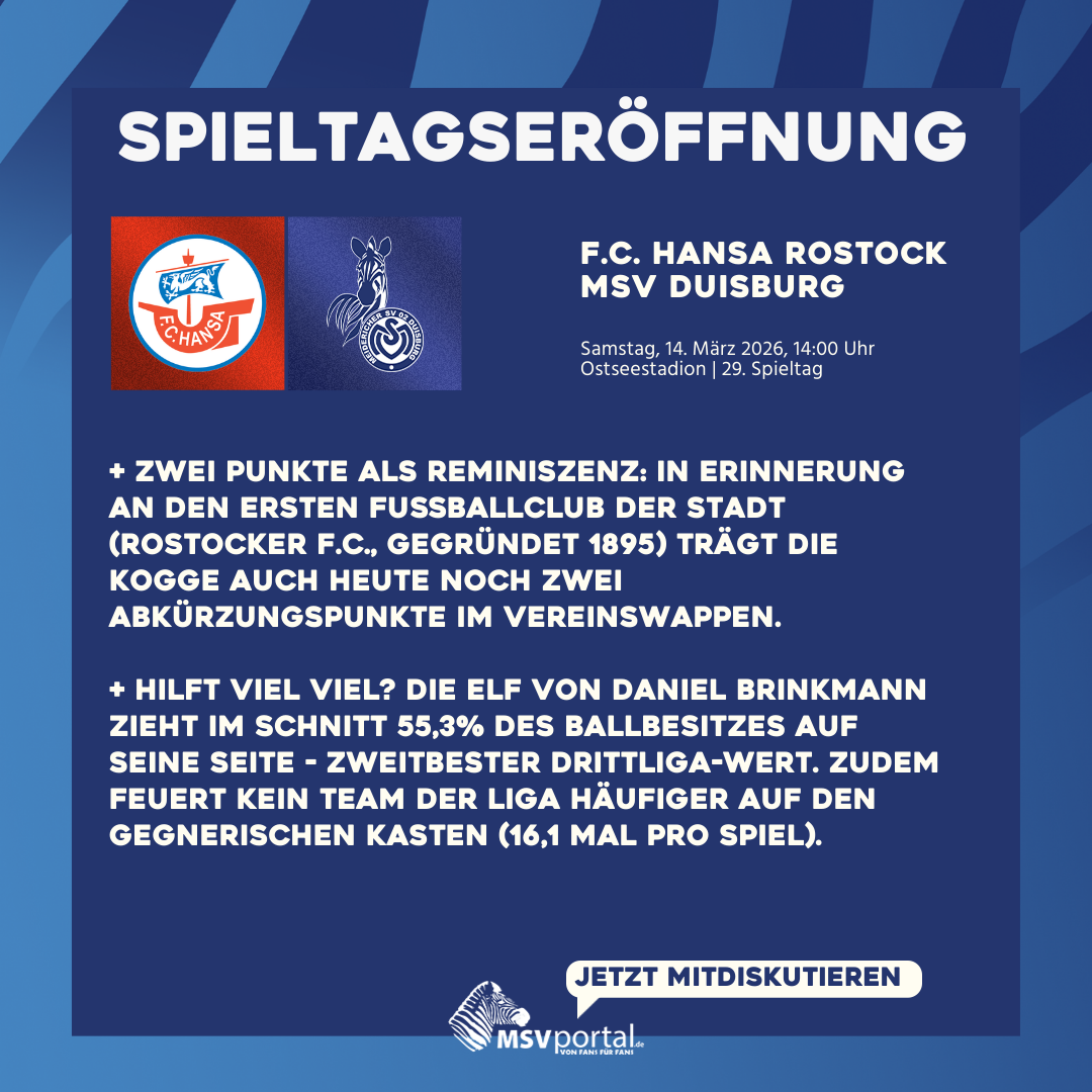 Die Sonne lacht, das Zebra grüßt von Platz drei – wir freuen uns auf das Top-Spiel am Samstag, 14. März 2026, um 14 Uhr beim FC Hansa Rostock. In eurer Wedau-Woche halten wir euch mit allen wichtigen News rund um das Spitzenspiel auf dem Laufenden.