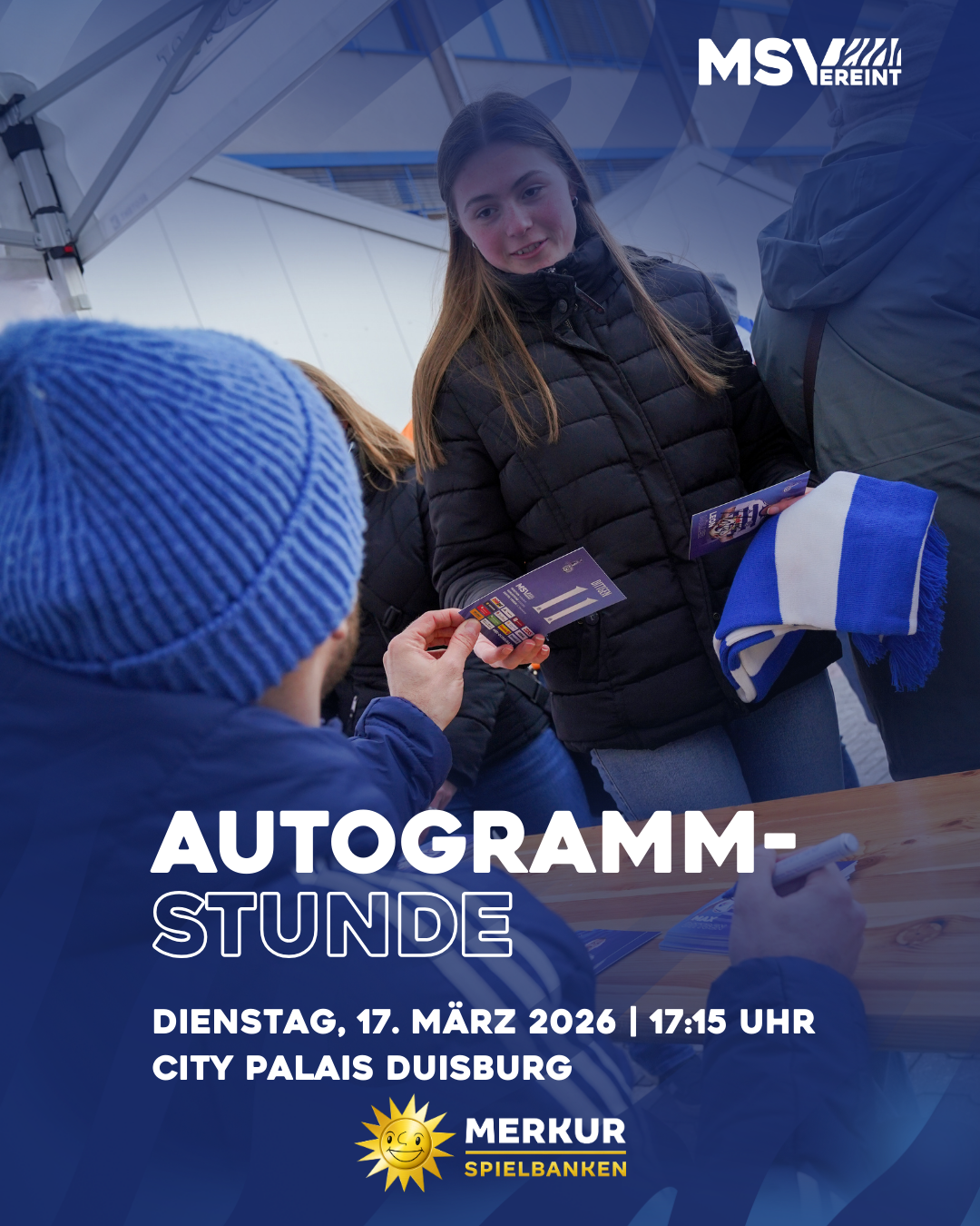 Am Dienstag, 17. März 2026, könnt ihr Dietmar Hirsch, Marvin Höner, Sven Beuckert, Niklas Jessen, Flo Egerer, Can Coskun, Josh Bitter und die Dominiks Kother und Becker bei der großen MSV-Autogrammstunde im City Palais Duisburg (1. OG / Landfermannstraße 6, 47051 Duisburg) treffen. „Anstoß“ ist dann um 17:15 Uhr. Wir freuen uns auf euch!