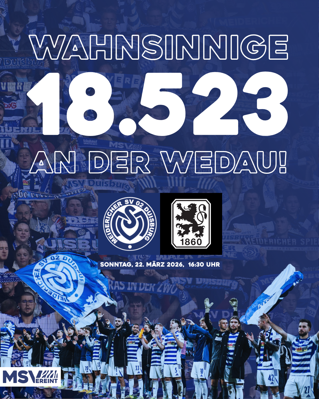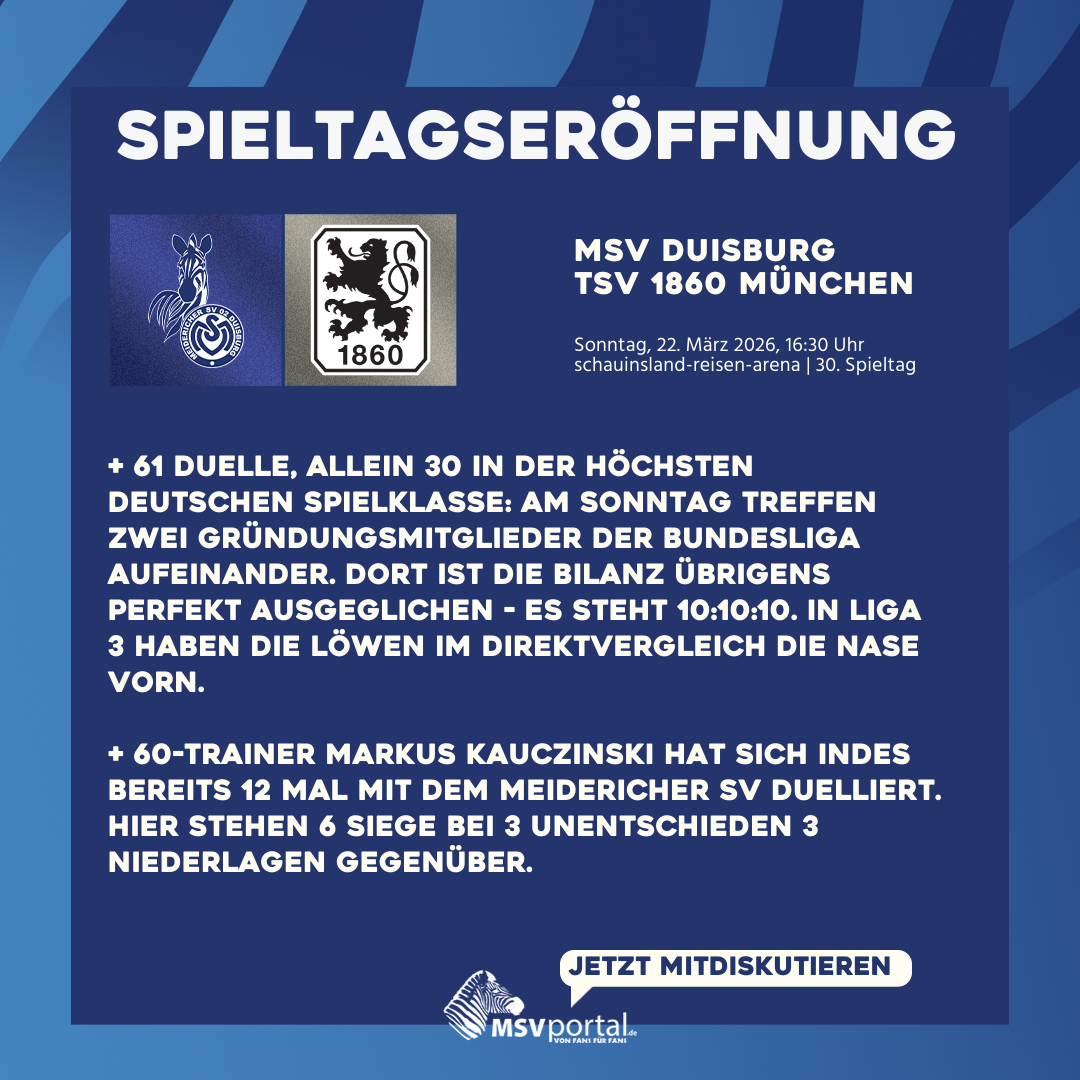 Auf geht's für unsere Zebras in die Löwen-Woche! Unsere Meidericher Jungs treffen am Sonntag, 22. März 2026, ab 16:30 Uhr in unserem Wohnzimmer an der Wedau auf den TSV 1860 München. Gegen den Tabellen-Siebten wollen wir #MSVereint mit euch gemeinsam Heimsieg Nummer 11 holen!