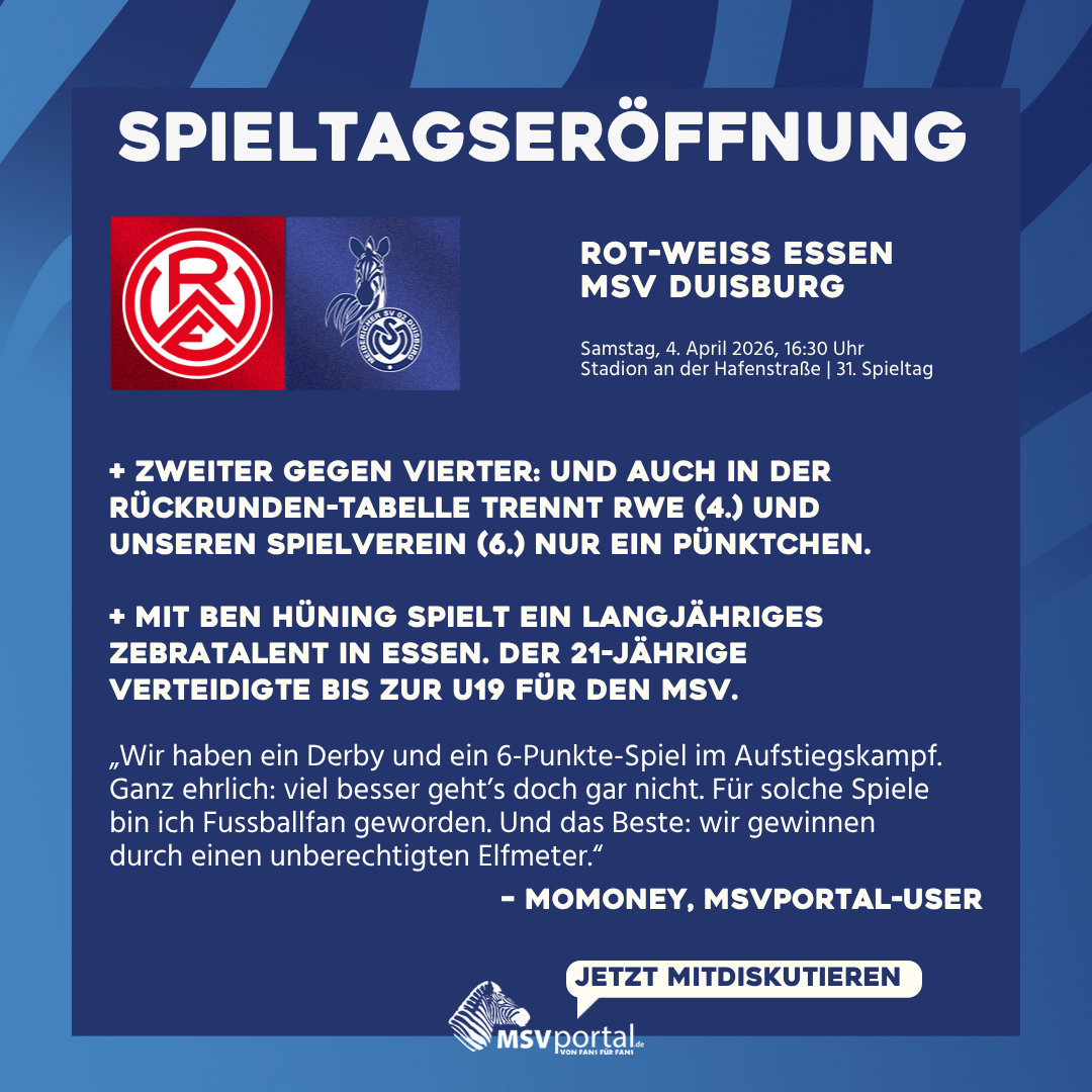 Fangen wir an mit einer nüchternen Info zum Wochenbeginn: Unsere Zebras schnüren nach einem Regenerationstag wieder am Dienstag ihre Schuhe. Um 10:30 Uhr geht's an der Westender Straße wieder los. Am Mittwoch erwartet unser Trainerteam die Meidericher Jungs eine halbe Stunde (11 Uhr) später auf dem Platz. Donnerstag und Freitag bleibt der MSV unter sich und übt unter Ausschluss der Öffentlichkeit. Am Samstagnachmittag folgt dann ein paar Kilometer östlich der Anpfiff.