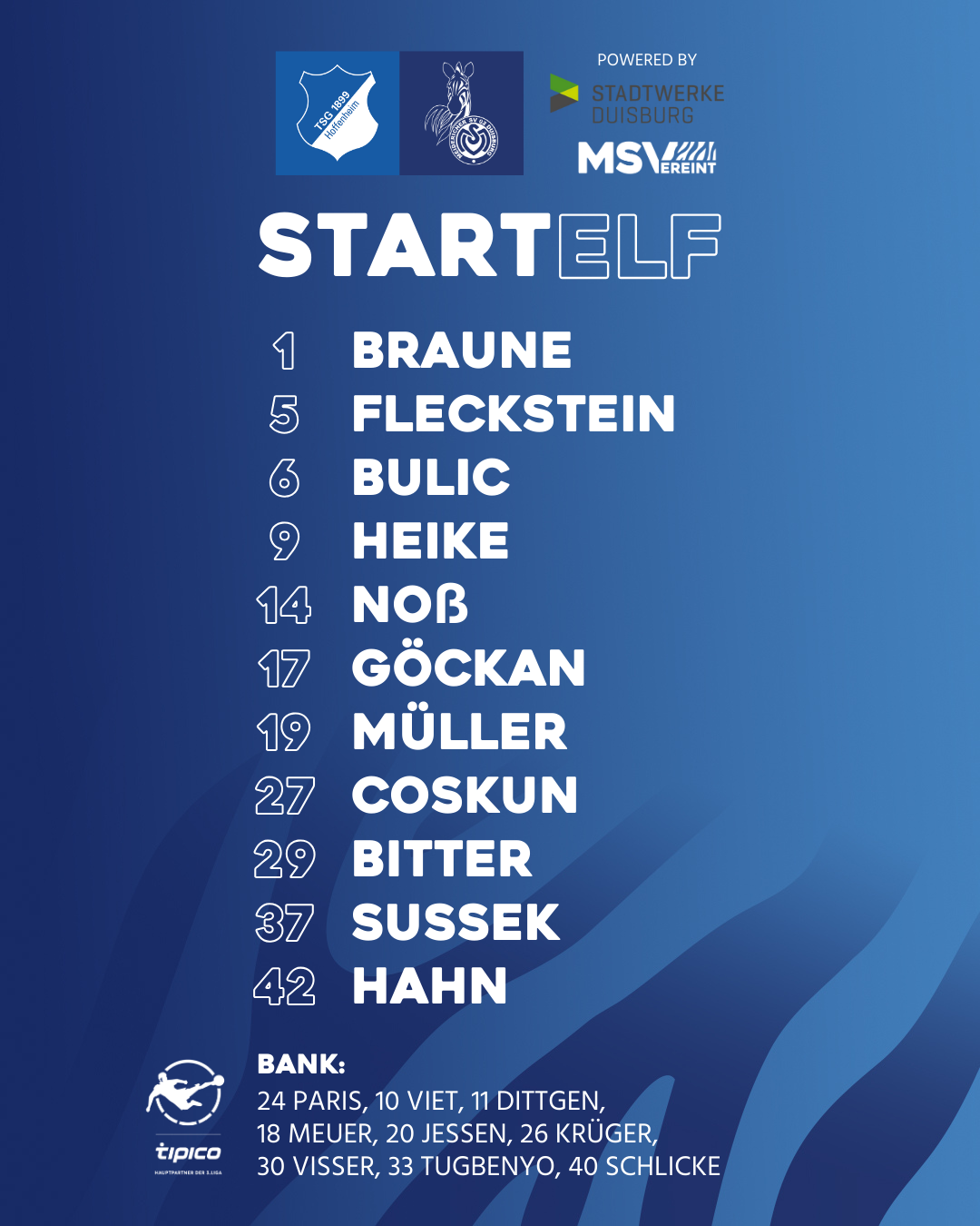 Eine Stunde und eine Minute vor dem Anstoß. Hier ist unsere Mannschaft für +90 Minuten gegen "Hoffe". 🔵⚪️