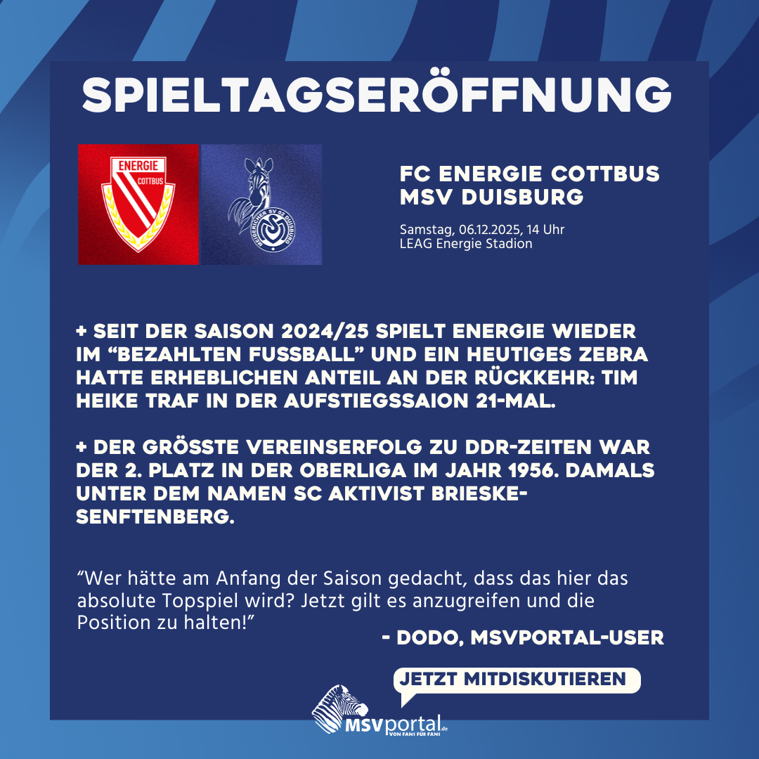 Lausitz calling! ☎️ Mit dem Heimsieg gegen Aachen im Rücken richtet sich unser Blick nun auf die nächste Nummer: Am kommenden Samstag, 6. Dezember 2025, treten unsere Meidericher Jungs (#1 auf der Schnellwahltaste) auf den FC Energie Cottbus (#2). Alles Wissenswerte zum Aufeinandertreffen im Stadion der Freundschaft gibt's hier nach und nach im MSV-Blog gelistet.
