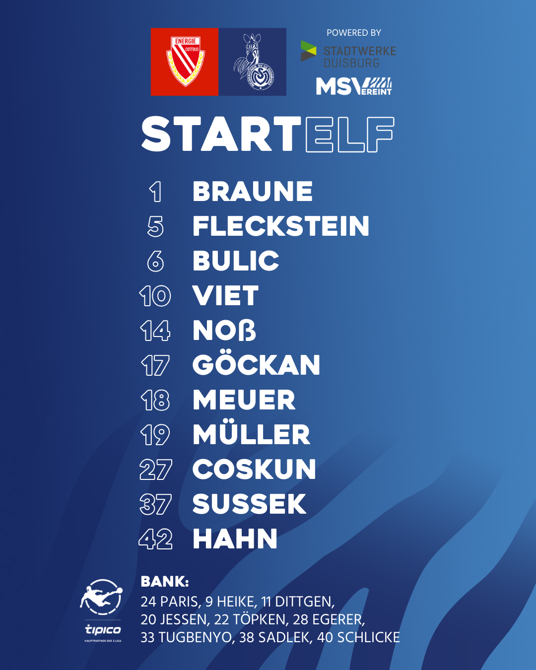So startet das Team Meiderich ins Spitzenspiel. Mert Göckan ersetzt den Gelb-gesperrten Josh Bitter. Gabriel Sadlek und Flo Egerer rücken für Josh Bitter und Andy Visser in den Kader. Ex-Energie-Stürmer Heike geht als Joker ins Match.