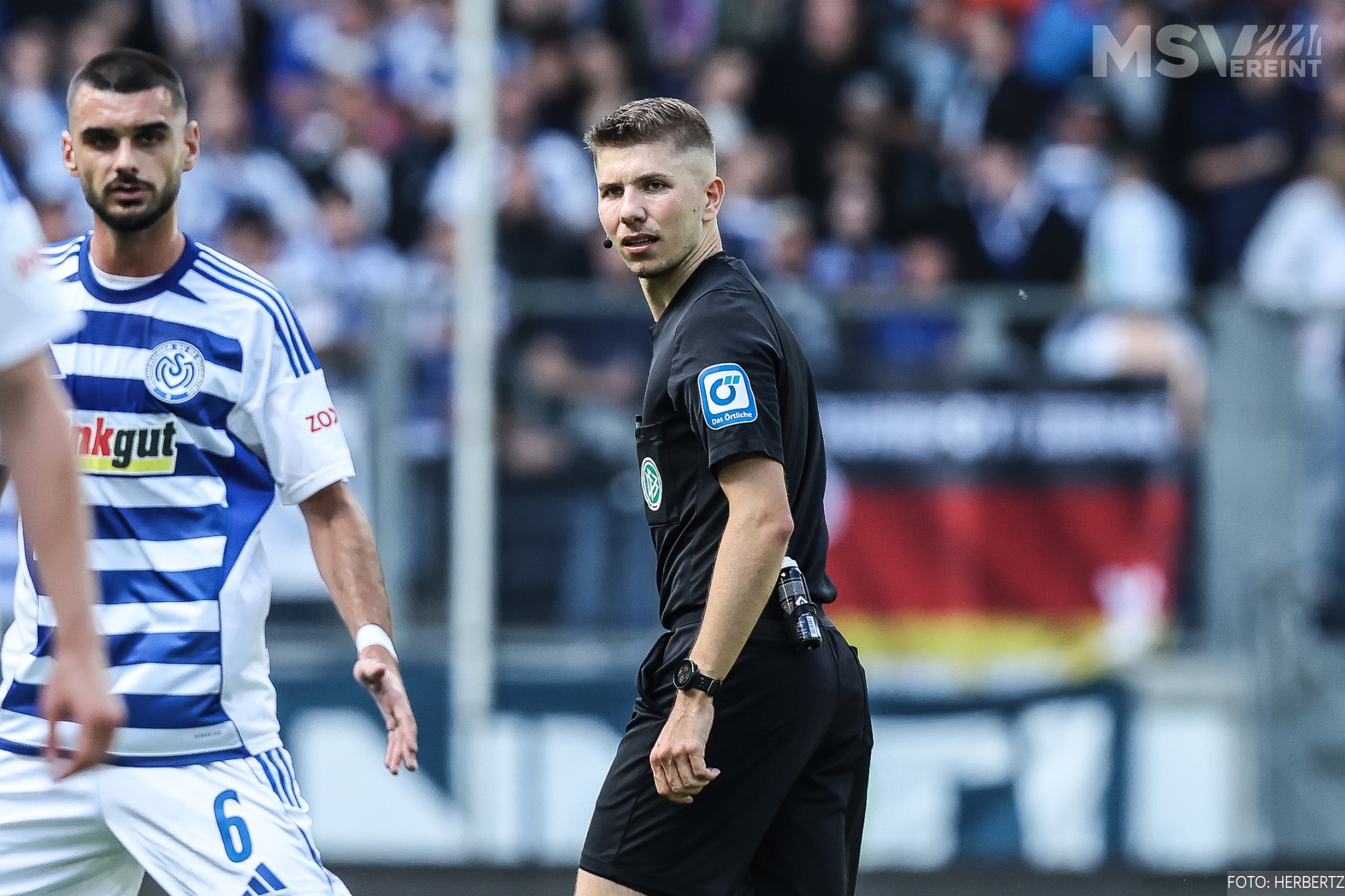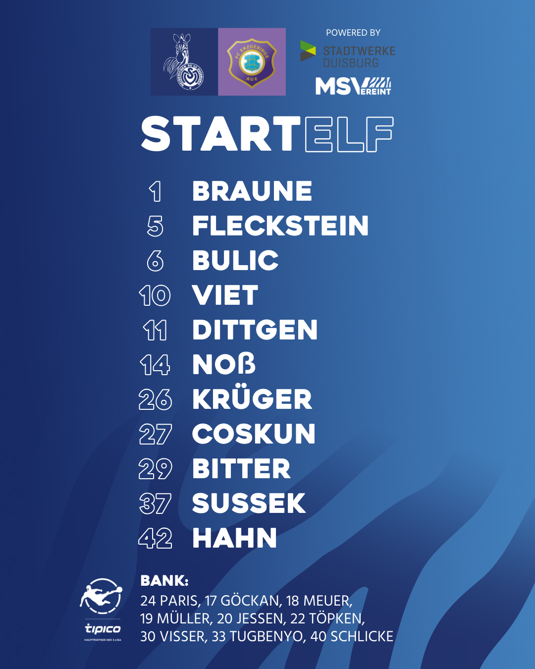 Der MSV baut aus der altbekannten Viererkette auf. Conor Noß orientiert sich auf die zentrale Zehnerposition. Max Dittgen beginnt auf der rechten Seite.